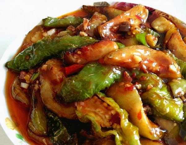 食材:長茄子、青辣椒、西紅柿、香蔥、大蒜、薑、鹽、淀粉、白糖