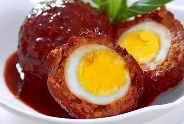 2.將去皮的熟雞蛋分別包入肉餡中,做成5個大丸子。