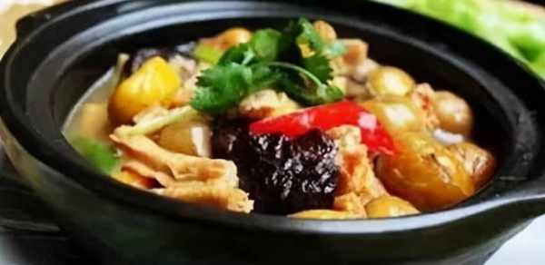 材料:栗子、腐竹、香菇、青椒塊、紅椒塊、香芹段、薑片、鹽、蘑菇粉、醬油、胡椒粉、芝麻油