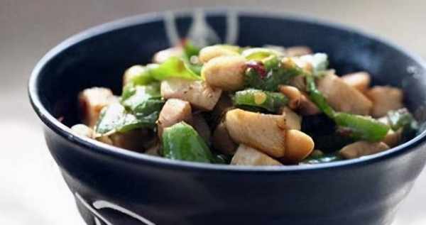 1、杏鮑菇洗凈切丁,不要太小。辣椒切丁。花生炒熟或者用烤箱烤熟,放涼
