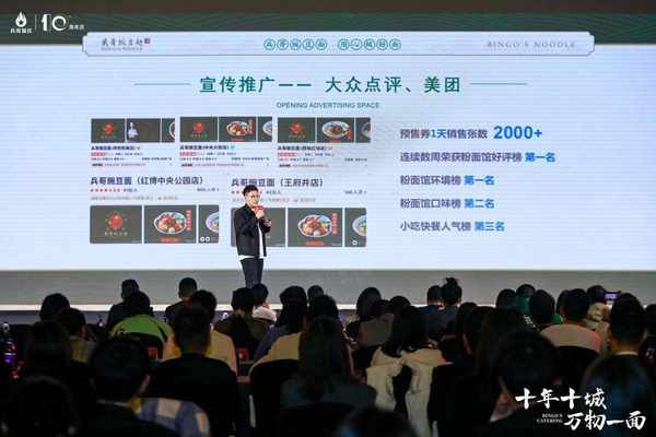 十年兵哥,千店展望,兵哥餐飲品牌顧問陶海翔分享瞭兵哥整個品牌的戰略和未來的規劃。“兵哥這10年來形成瞭他穩定的產業輸出,穩定的模型輸出以及內在的文化。作為行業標桿,兵哥豌豆面從民間以及政府層面都獲得瞭極高的贊譽。為什麼我持續地看好兵哥豌豆面?除瞭剛才提到的一些基本狀況以外,其實跟兵哥所處的賽道以及品類是有著密不可分的關系。”陶海翔用“自帶流量,持續破圈”做瞭概括,並從賽道、品牌、產品三大維度進行瞭總結分析。從賽道專業角度出發,面食本身就是強剛需、高復購的品類,所以它的市場規模會比較大。產品層面來看,兵哥豌豆面它除瞭是一個品牌,在門店也是點單量最高,消費者滿意度最高的爆品,而這個爆品還在持續的迭代和優化。“兵哥已經創造瞭單店月銷售額突破100萬的佳績。”