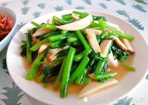 4、 杏鮑菇炒香後,把茼蒿倒入鍋中,和杏鮑菇一起翻炒1分鐘,再把剩下的一半蒜末倒入鍋中,炒出香味後即可。