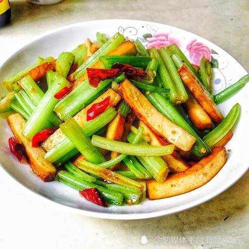 6、水分差不多收幹後放入芹菜葉和小米椒炒勻就可以啦。