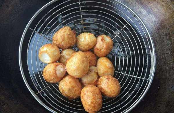 2、鍋裡放點油,當油溫六成熱的時候就可以下鵪鶉蛋炸瞭,炸至外表起虎皮,撈起來過冷水。