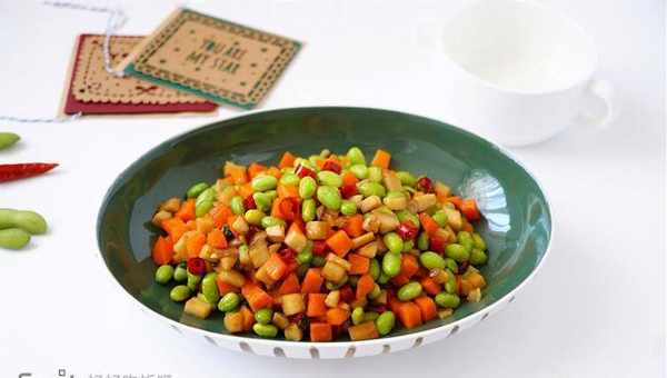 6、最後加煮熟的毛豆、1小勺食鹽煸炒均勻,大火將湯汁燒幹即可。