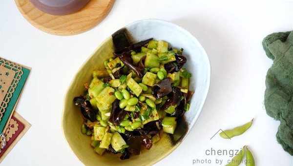 6、把黃瓜、木耳、毛豆放入盆中,加入蒜末、香菜,加鹽1小勺,加白糖1/2小勺,生抽、香醋各1湯匙,加點辣椒油和香油,攪拌均勻即可。