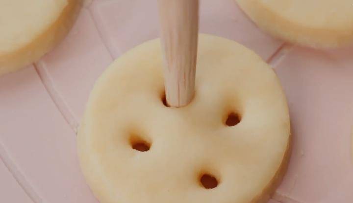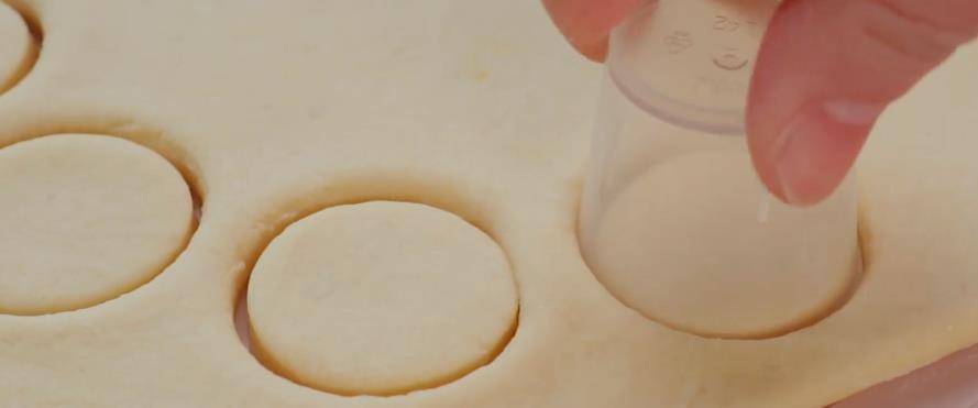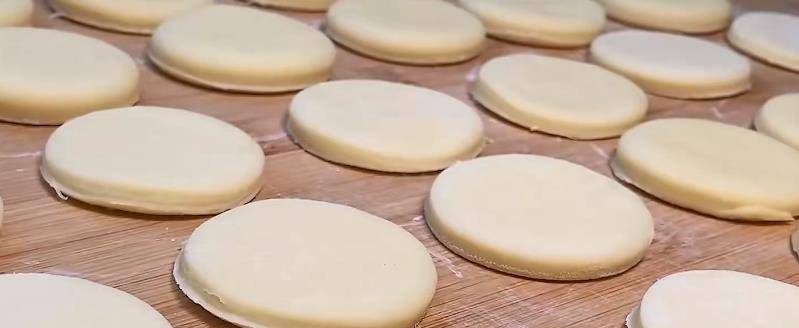 4、 取出面團,搟成0.5cm厚的薄餅,再用圓型模具,在面餅上壓出小圓餅,剩下的邊角料繼續搟餅,再壓加圓餅,直到將面團用完為止。用筷子在小圓餅上紮出四個小洞,方便烙餅時排氣。