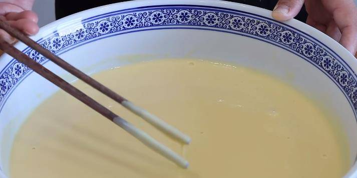 3、 發酵好的面糊有小氣泡,用勺子攪動均勻,排出氣體。