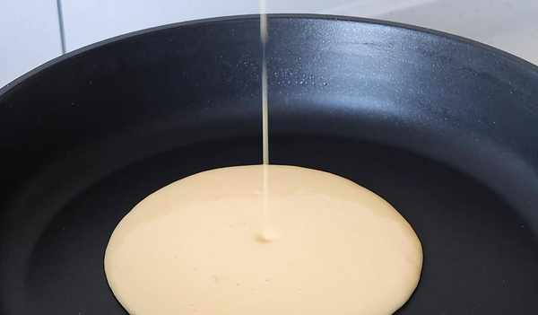 4、 準備一個平底不沾鍋,倒入一勺玉米面糊,開小火煎成兩面金黃色裝盤,就做好瞭。