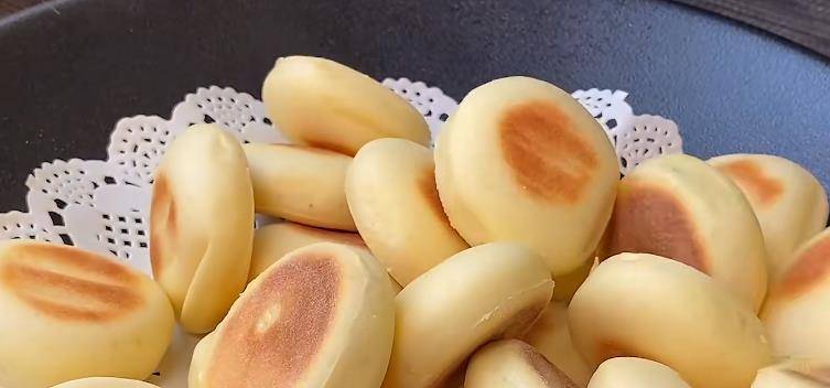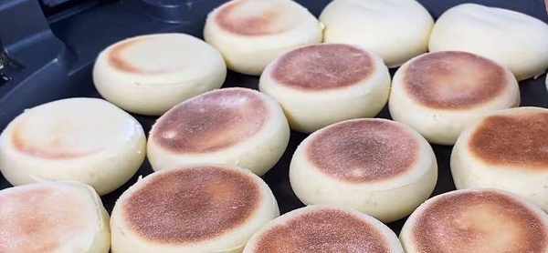 4、 將醒好的小餅擺在電餅鐺中加熱,烤至兩面微微金黃色後取出,掰開後可以看到小餅松軟回彈,就是做好瞭。