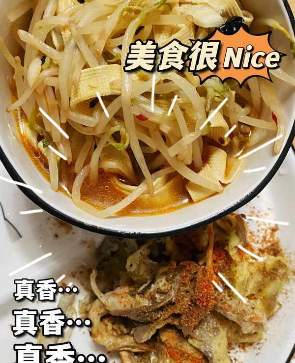 酥炸蘑菇、麻辣豆皮,裡面加瞭豆芽菜。