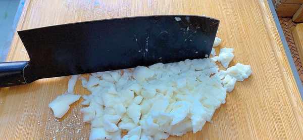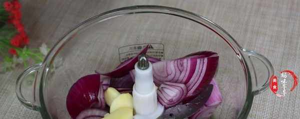 1、首先咱們準備半個洋蔥切成小塊,切好之後放入到料理機裡,放上十幾顆大蒜,然後把它打成碎末備用。