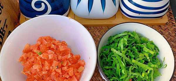 1、準備半個胡蘿卜去皮切丁,青菜洗凈切碎,然後裝碗備用。