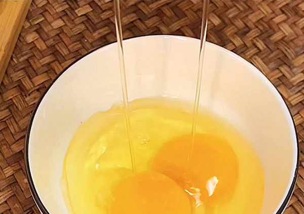 4、小碗裡打上3個雞蛋,然後攪散,雞蛋可以加入幾滴香醋,這樣炒出的雞蛋會更加蓬松美滑,還能去除腥味。