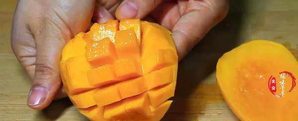 4,趁蒸雞蛋的時候,咱們切一個芒果,以芒果核為中心,從兩邊切下來,切好的芒果橫豎切上幾刀,然後將芒果翻過來,將芒果丁切下來。