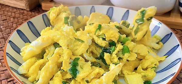 5、鍋裡油熱放入蔥花炒出香味,然後淋入雞蛋液翻炒均勻,加上一點鹽調味,炒成小塊就可以出鍋瞭。蔥花搭配雞蛋說實話比肉還解饞。