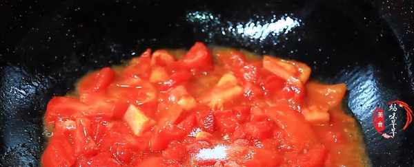 4,鍋裡倒入稍微多一點的油,油熱後先倒入西紅柿翻炒上幾秒鐘,然後加入一勺鹽,把西紅柿的汁水炒出來,炒出汁水後加入2大碗清水,蓋上鍋蓋煮開。