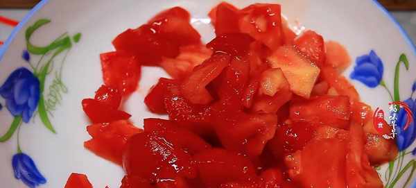 2,準備3個西紅柿,中間給它劃上十字刀,倒入開水浸泡一會兒,泡好的西紅柿撕掉表皮,然後切成小塊備用。