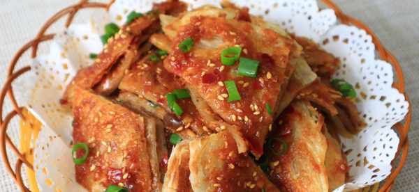 5、出鍋後咱們在表面均勻地刷上一層醬料,然後撒上蔥花,多煎幾張餅,疊在一起刷上醬料,這道懶人版的傢庭版醬香餅就做好瞭。