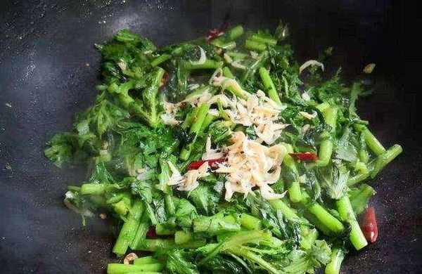 然後把茼蒿均勻地鋪在上面,蓋上蓋子燜上一分鐘,燜好後開大火,翻炒均勻就可以出鍋裝盤瞭,茼蒿吸收瞭蝦皮的鮮味,就更加美味好吃瞭,趕緊做起來吧。