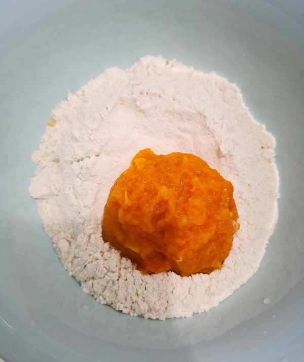 南瓜蒸熟後壓成泥,晾涼至不超過40度再加到中筋面粉裡,南瓜泥和中筋面粉的比例約為1:5或者1:6。