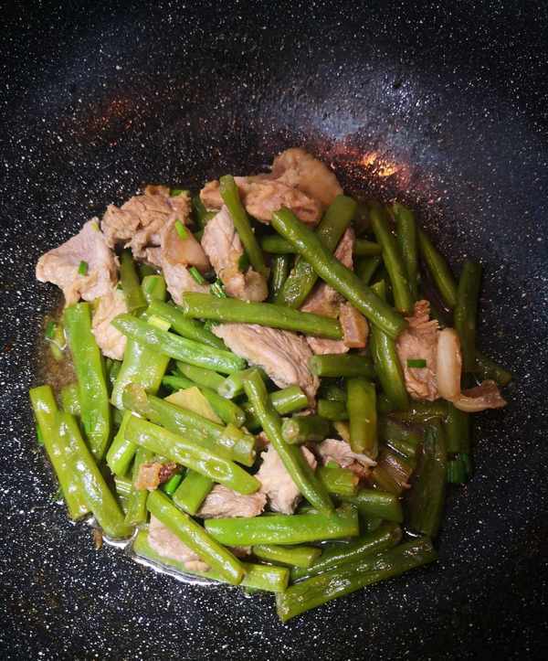 ③倒入豆角翻炒幾下,加適量水,大火煮開後轉中火煮至豆角快要綿軟後加適量鹽、生抽翻拌均勻再倒入醃制好的瘦肉,煮至豆角綿軟、瘦肉變色,出鍋前撒點蔥花即可。