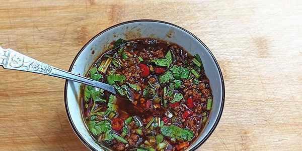 【步驟五】:等炒料稍微放涼,然後依次放入生抽2勺、雞精1勺、白糖1勺、香醋1勺、小米辣、剩餘的蒜末、香菜末,攪拌均勻兌成調料汁。