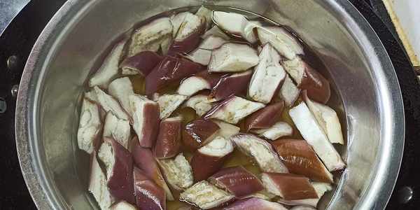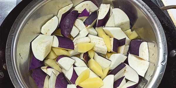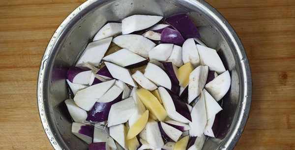 (2)茄子和土豆泡的時候放一點白醋,可以防止發黑,泡在水裡面蒸可以有效防止營養減少,同時也不容易變色。