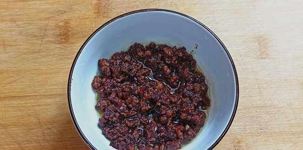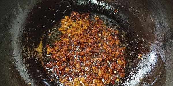 【步驟四】:蒸茄子的時候,取一個炒鍋,放入一勺油,把肉末放入鍋中,小火炒熟,放入一半的蒜末和黃豆醬,炒出醬香氣質,然後再放入一勺辣椒面,翻炒出香味,然後盛出來放入碗中。