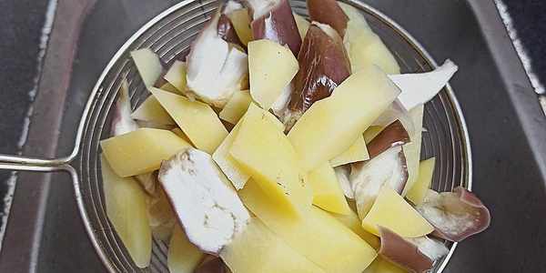 【步驟六】:土豆和茄子蒸熟,取出來,把茄子土豆倒入漏勺中,把水瀝幹放涼。