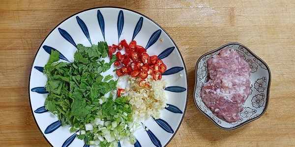 【步驟二】:把豬瘦肉切成末、香蔥切成末、香菜切成小段、大蒜拍碎剁成蒜末、小米辣切成圈、分別裝盤備用。