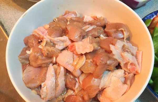 步驟二:喜歡吃雞皮的可留著,但雞皮不太健康,我還是去除瞭,再切成合適大小的塊狀,略大點會更好吃。