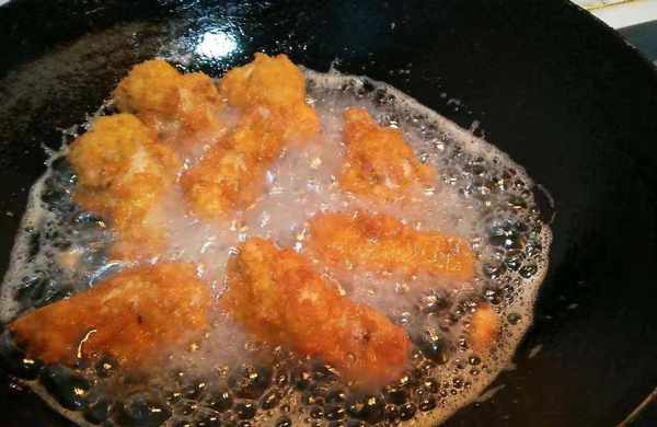 步驟九:為瞭防止雞塊外殼變軟,把油溫燒得更熱一點時,再把雞塊倒回鍋中復炸一遍,裝盤食用即可。