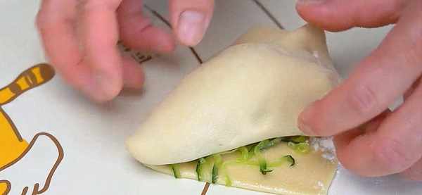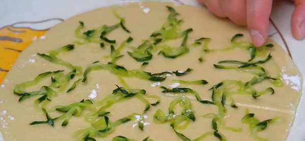11.然後先在表面刷一層食用油,然後撒點幹面粉,這樣它就會分層。然後把前面的黃瓜絲撒一點上去,最後在半徑處切上一刀。