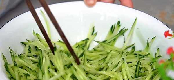 3.看到出水瞭之後擠掉裡面的水分,黃瓜絲放在一邊備用。時尚留著和面。