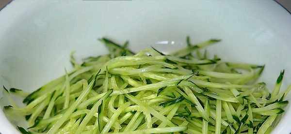 1.準備一根黃瓜,清洗幹凈表皮。市場買回來的話記得用鹽水加小蘇打浸泡一會。然後再搓洗幾遍,再用 擦絲器把它擦成細絲。沒有工具的就用刀切。
