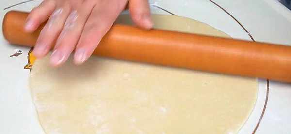 10.取一份面劑子,整理圓潤,再按扁,然後用搟面杖把它搟成圓形面片,厚度在0.3厘米左右。