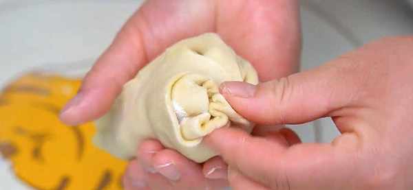 14.然後豎起來,大頭在下,按扁,一個生坯就做好瞭。全部按照這個步驟做好,然後放在一邊松弛10分鐘。
