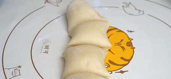 9.不用揉,直接移到案板上,搓成長條,分成四等分。