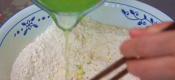 6.盆中倒入350克面粉,再磕入一個雞蛋,先把雞蛋攪散再取170毫升的黃瓜汁和面,一邊倒一邊攪拌。把它攪拌成面絮狀。