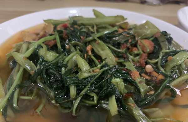 夏天不喜歡吃飯的朋友,可以炒上一盤空心菜梗配白粥喝,特別開胃。