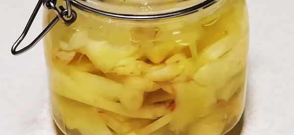 2、2小時後,再把醃制好的薑片,給它擠幹水分,放入一個無油無水的罐子裡。