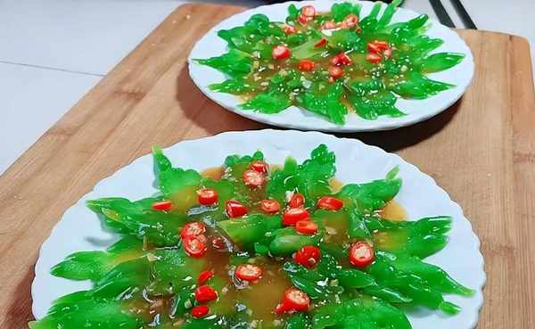 接著用辣椒面、大蒜和醋等,調制一份料汁,直接淋到苦瓜上,最後撒點白芝麻拌一拌就能吃。