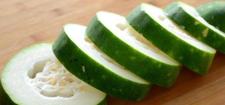 直接用刀將其從中間切開,去掉裡面的瓤,洗凈後切成片,倒入加瞭鹽的開水中煮一下,撈出來控去水分後裝盤裡。