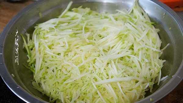 角瓜雞蛋韭菜餡做法:角瓜洗凈去瓤擦絲,撒鹽醃制10分鐘,攥掉水分。