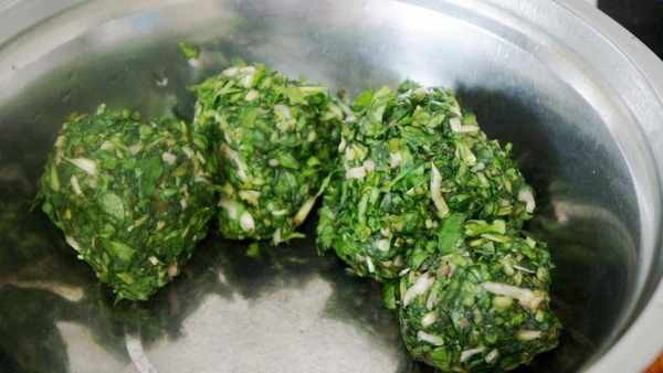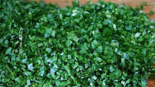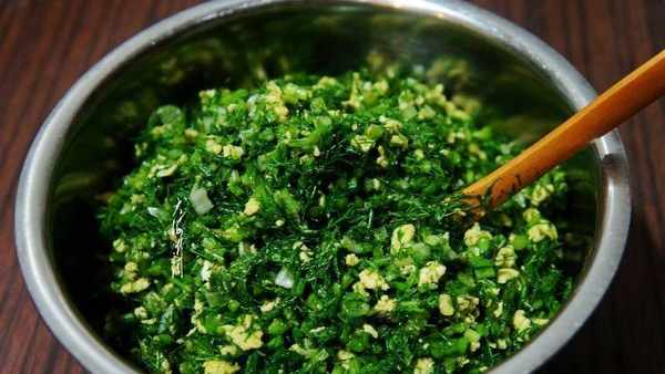 新鮮婆婆丁摘洗幹凈,切碎,撒點鹽醃制10分鐘然後攥掉水分。