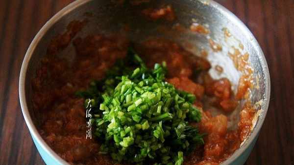 裡脊肉洗凈切碎,大蝦去皮挑出蝦線,洗凈後切碎,韭菜摘洗幹凈切碎。