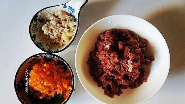 蔥薑去皮洗凈切末,青紅椒切碎,牛肉切小塊入料理機絞成肉泥。