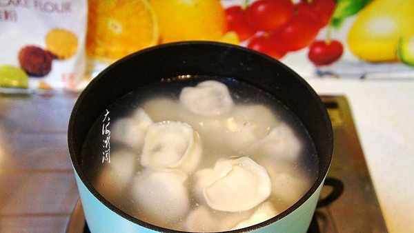 煮餃子:鍋中加入適量的水,大火燒開,下入包好的元寶餃子,煮開,加入半碗冷水繼續煮開,再次加入冷水,第三次煮開餃子煮的恰到好處,出鍋即食,喜歡熱湯水餃,下入生菜葉少許青椒丁、少許香菜末,少許鹽調味。