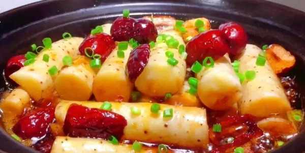 3、再準備一個砂鍋,倒入適量大蒜子,擺上切好的鐵棍山藥,再把調好的料汁淋在上面。再放入適量的油,再把紅棗撒在上面,全程中火煮六分鐘,中間再用小勺子反復把湯汁淋在鐵棍山藥上面,會更加入味。再撒上少許的蔥花,就做好瞭。